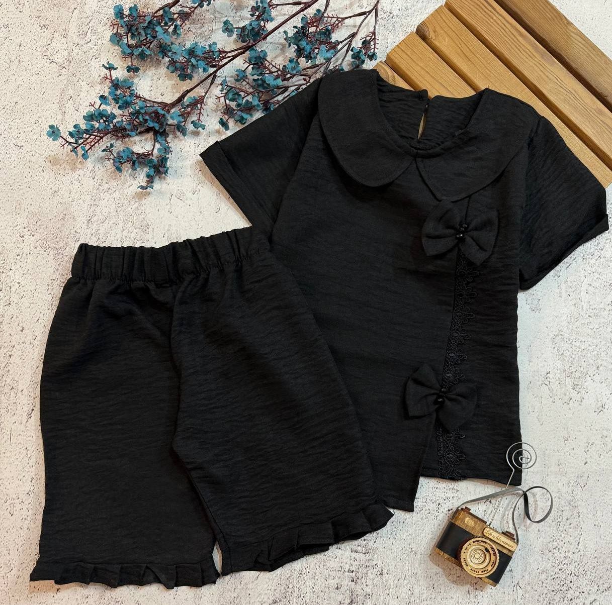 بلوز شلوارک مشکی یقه ب‌ب دخترانه ی ابروبادی طرح پایون