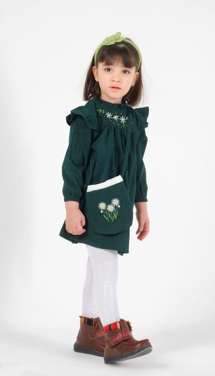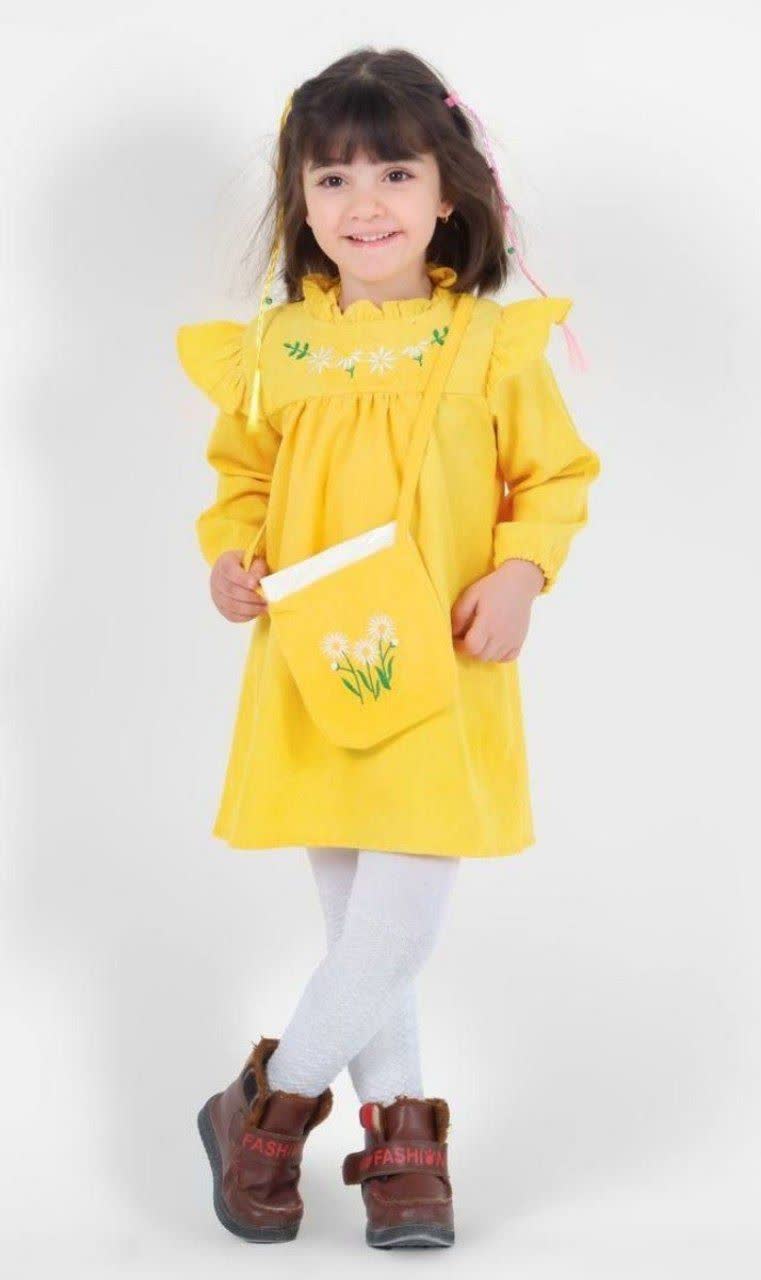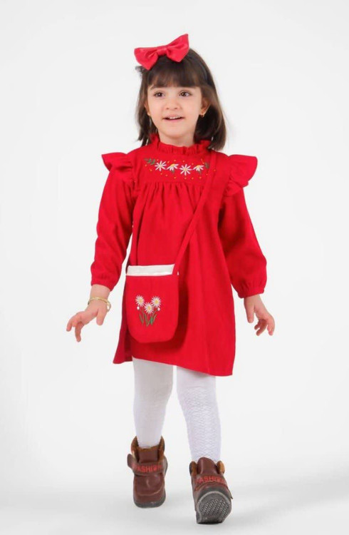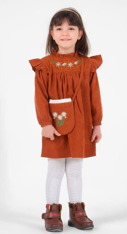 پیراهن دخترانه مخمل کبریتی گلدوزی شده همراه با کیف ست