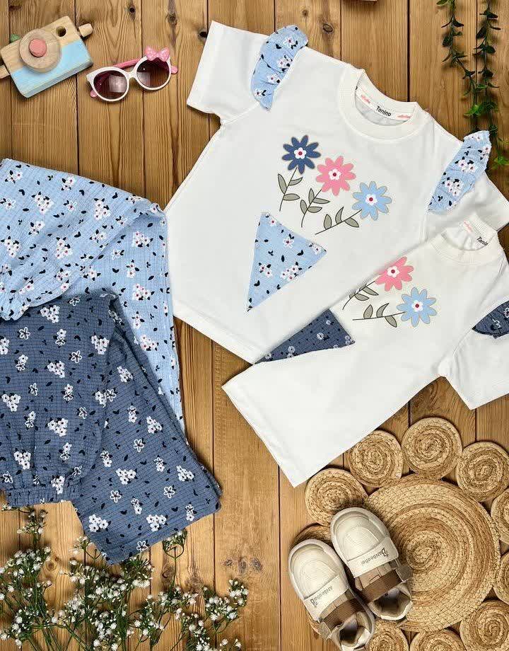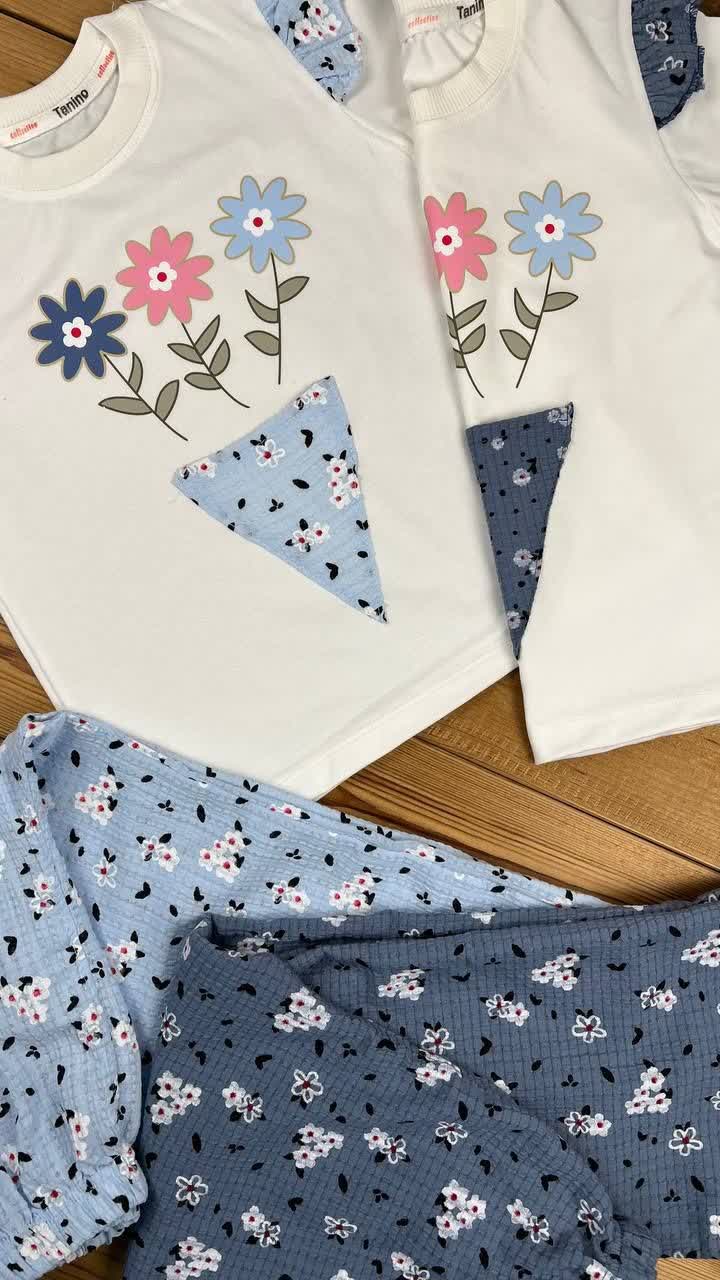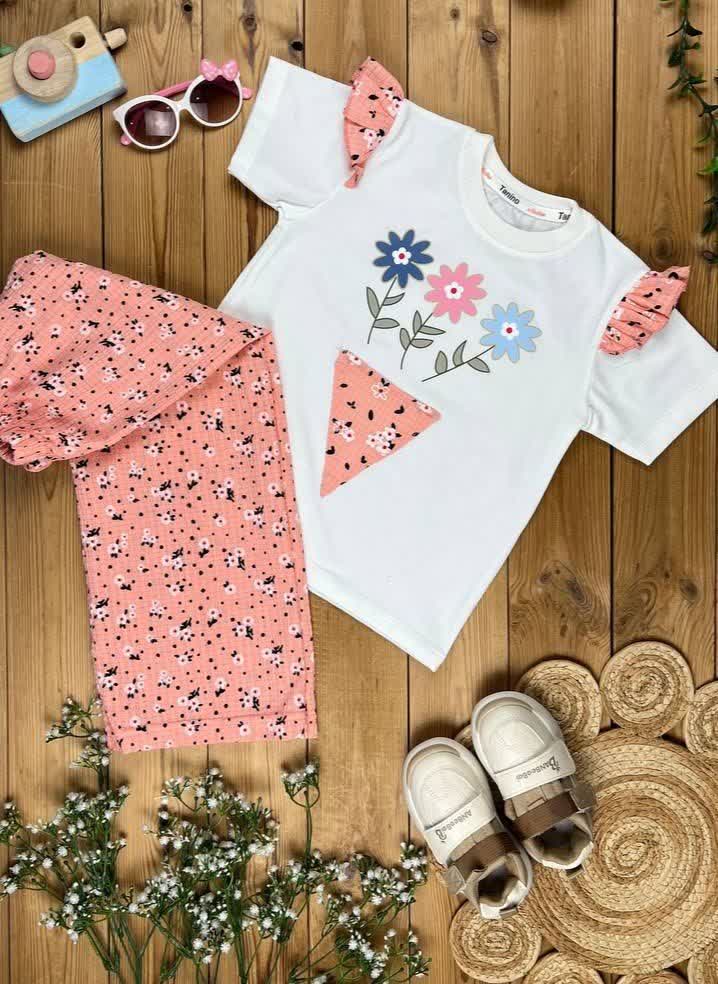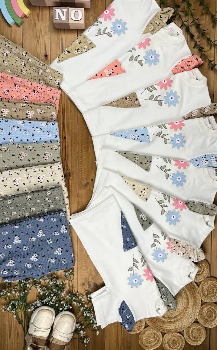 ست تیشرت شلوار دخترانه پنبه/ کاملت طرح گل و گلدان