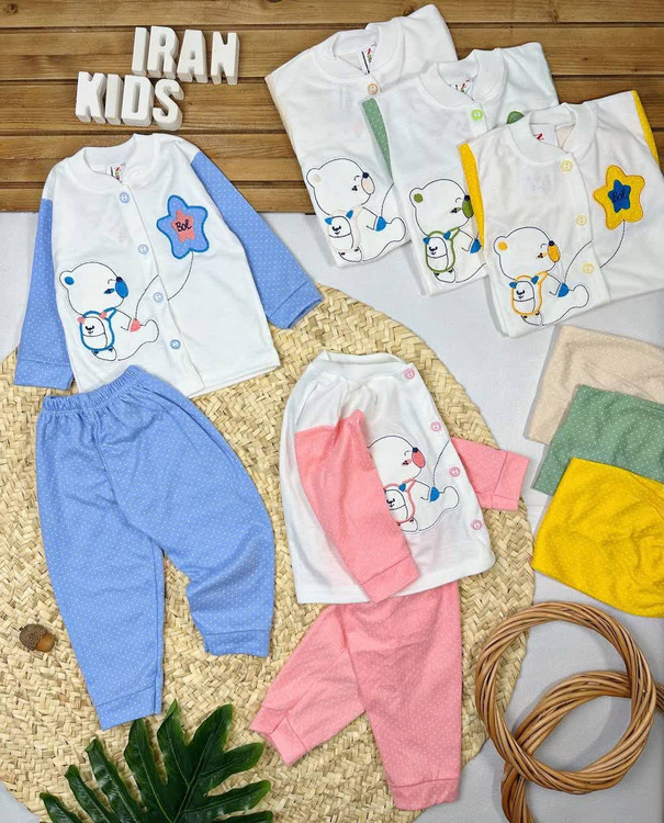ست دو تیکه ی بلوز شلوار پنبه ی درجه یک نوزادی، جلوی بلوز دکمه داره و استفاده از لباس رو بسیار راحت میکنه
